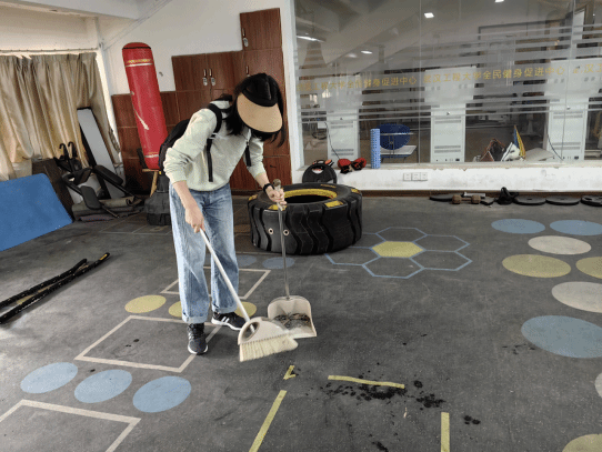 同学们对操场看台与健身房两个区域进行了清理打扫。在操场看台区域,大家各司其职,有的负责接水,有的忙着擦拭椅子,有的专注捡拾垃圾、清扫地面。他们认真地清理每一个角落的垃圾,细心地擦拭每一个座椅,确保看台区域的椅子洁净如新,地面一尘不染。