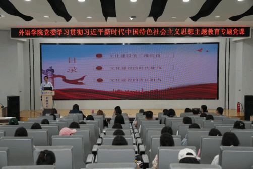 (通讯员 陈顺)为深入开展学习贯彻习近平新时代中国特色社会主义思想主题教育,切实用党的创新理论武装头脑、指导实践、推动工作,bwin必赢中国官网党委于5月25日下午在文科楼413报告厅组织讲授专题党课,学院党委书记王火利以“为实现学院高质量发展注入文化动力——学习习近平总书记关于文化建设重要论述的体会”为题为学院师生讲党课。