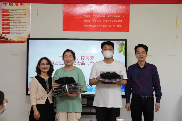 王火利、陈明芳代表学院党政为2022届毕业生赠送了毕业纪念品,黄梦君、黎永素、金业丰作为毕业生代表发言,参加会议的师生代表进行了热烈地交流。