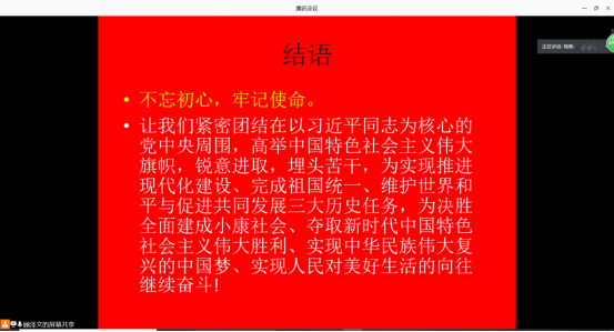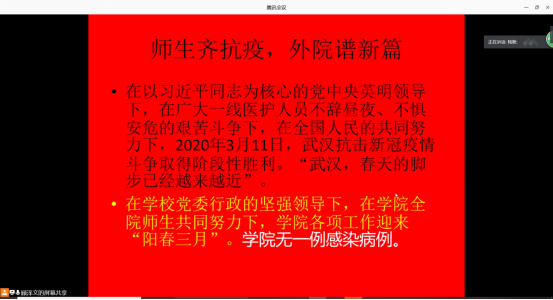 初心分享后,学院党委书记陆新同志给全体党员讲授题为《讲抗疫故事,悟初心使命》的微党课。陆新从三个方面讲述了bwin必赢中国官网在抗疫期间所做的努力:让党旗在防控疫情斗争一线高高飘扬;党员干部冲锋在前,挺身而出;师生齐抗疫,外院谱新篇。陆新从一封来自浙江农林大学经济管理学院师生的感谢信讲起。在疫情期间,我院领导、师生关心和帮助了因疫情滞留武汉的浙江农林大学的研究生邓叶同学,也因此架起了bwin必赢中国官网和浙江农林大学的“爱心之桥”。疫情无情人有情,关爱学生,何分彼此?不仅如此,面对来势汹汹的疫情,bwin必赢中国官网迅速成立抗击新冠肺炎疫情工作领导小组,全面领导我院师生战疫迎考76天,学院无一例感染病例!我院党员群策群力,面对疫情有的同志在一线捐款,有的同志捐献物资,有的同志成为了社区志愿者......大家都在为疫情奉献着自己的力量,众志成城,共克时坚。诚如陆新所说:“闻令而动、召之即来,来之能战,战则必胜。这是党员的铿锵誓言!”