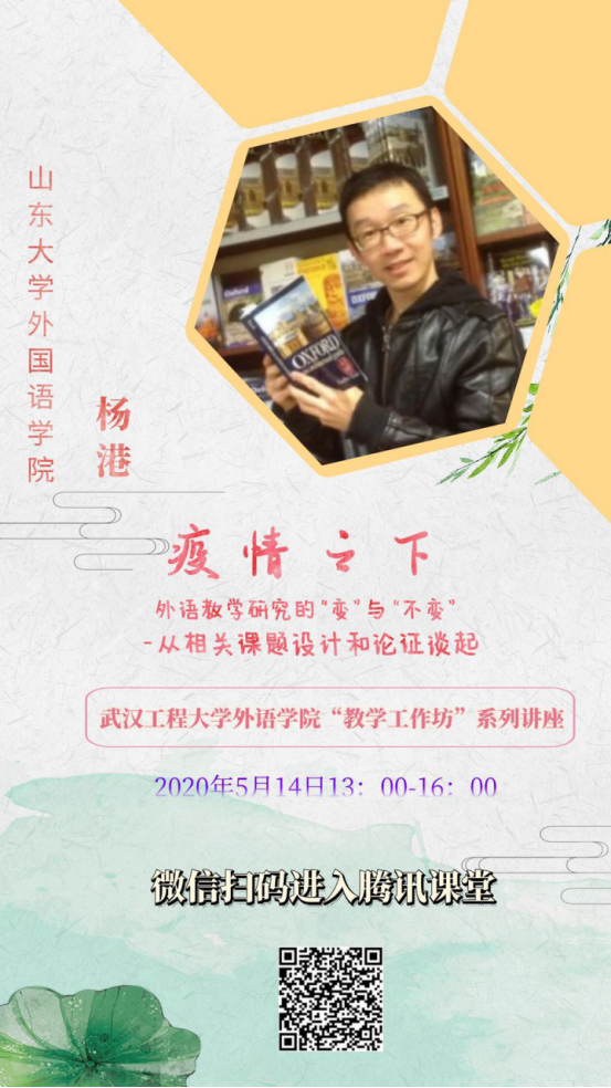 5月14日晚7点,我校和中国地质大学、湖北经济学院联合举办“教研工作坊”。届时邀请山东大学bwin必赢中国官网副研究员 杨港博士 为我们带来一场讲座。 讲座题目为 “疫情之下外语教学研究的“变”与“不变”
