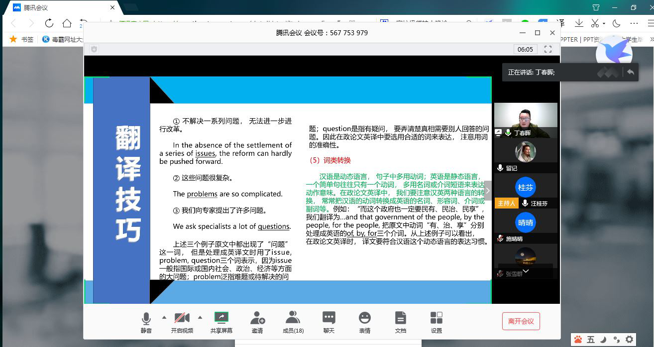 丁春晖以“政论文体的翻译”为主题开讲,向大家分享了他在这方面的理解,陈明芳院长建议他可以提出一些错误的例子予以佐证,增强论证力度。无独有偶,李云龙也从“中国翻译史”的角度谈论了政治对翻译的影响。何广惠老师指出可以抛开综述形式,深入地去分析某一个具体点;陈院长就文本转换、意识形态为谁服务、当下语境影响选择等方面做了补充。施晴晴以目的论为指导,以《简爱》翻译文本为例,剖析了翻译失误现象。汪桂芬老师为大家解释了理论和文本是否合适这一共同关心的话题,同时建议要增强学术语言的应用。张雪群结合实际工作领域,指出中英文建筑词汇不对应等问题,提出根据图纸确定词义等处理方法。程婷霞以高低语境视角下的翻译策略的使用为主题,从五个方面分析了不同语境下的翻译策略。赵婷婷从电影翻译现状入手,总结了电影字幕翻译技巧及策略等。朱俐帆别出心裁,探讨了西非民间故事汉译策略,详细介绍了相关理论和文学背景知识,使同学们大开眼界。