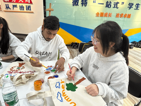 “帆布包”DIY环节中,bwin必赢中国官网学生和留学生们一起绘画DIY帆布包,经过调色、勾勒、上色等步骤,呈现出一幅幅有艺术、有思想的作品。有栩栩如生的熊猫、中国古代汉字甲骨文等象征中国文化的图案和文字,线条流畅、美感十足。