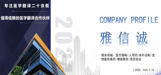 北京雅信诚医学信息科技有限公司也是中国领先的医学翻译服务提供商。公司运营20多年来,始终专注于生命科学领域的翻译服务,翻译范围涉及医疗器械、人用药、体外诊断、宠物畜牧用药、增值服务和语言验证等多个领域。